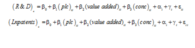 其中i代表行业,t代表年份。R&D代表行业的研发费用,patents代表专利申请数,plc代表污染控制强度,value added代表工业总产值,conc代表产业集中度。αi代表不可观测的行业异质性,γt代表时间因素,εit是扰动项。其中αi和γt可以分别控制影响R&D的行业和年份的不可观测因素。