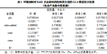 (一)环境规制对研发支出(R&D)的影响本部分分别用固定效应模型和随机效应模型进行估计,用STATA9.0做回归。然后通过进行Hausman检验发现,P值为0.9346,非常不显著,说明行业之间R&D的差别不太影响回归结果,所以可用随机效应模型。但是由于行业的R&D波动差异性很大,所以还需要对异方差进行检验。我们采用似然比(LR)检验方法检验异方差,发现P值为0.000,非常显著,因此我们最终选定广义最小二乘法(GLS)进行估计,以进一步控制异方差。由于产业集中度变量缺少2005年到2007年的数据,因此我们分别做了包含产业集中度变量的估计和不包含产业集中度的估计,估计结果依次见表1和表2。