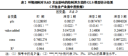 1)从表1的估计结果可以看出,1996年至2004年期间,环境规制对即期的R&D支出影响显著,环境规制能够刺激R&D支出。环境规制对滞后1,2期的研发支出影响均不显著,但是对滞后第3期研发支出影响很显著,环境规制强度(污染治理成本占产业总产值的比例)每增加1%,R&D支出占产业总产值的比例增加5.7% 。而在表2中,1997年至2007年期间,环境规制对R&D支出在当期和滞后期的影响都很显著。这说明环境规制对研发支出在长期内有较大的促进作用。