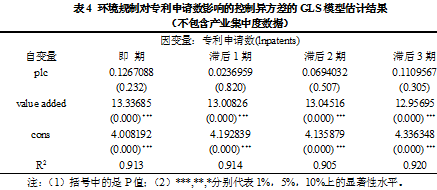 同样,我们采用控制异方差的广义最小二乘法来估计环境规制对专利申请数量的影响,估计结果见表3和表4。