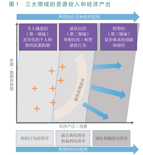 Grubb教授按照生产可能性前沿的左、中、右将气候变化治理分为三大领域,这三大领域分别表现为令人满意的差异化个人和组织决策机制、可以最优化的典型最优行为、可转型的复杂体系创新和演化;对应这三大领域存在的外部性问题可以用三大类支柱性政策加以治理,分别为能效政策、定价政策以及对基础设施和技术创新的投资。
