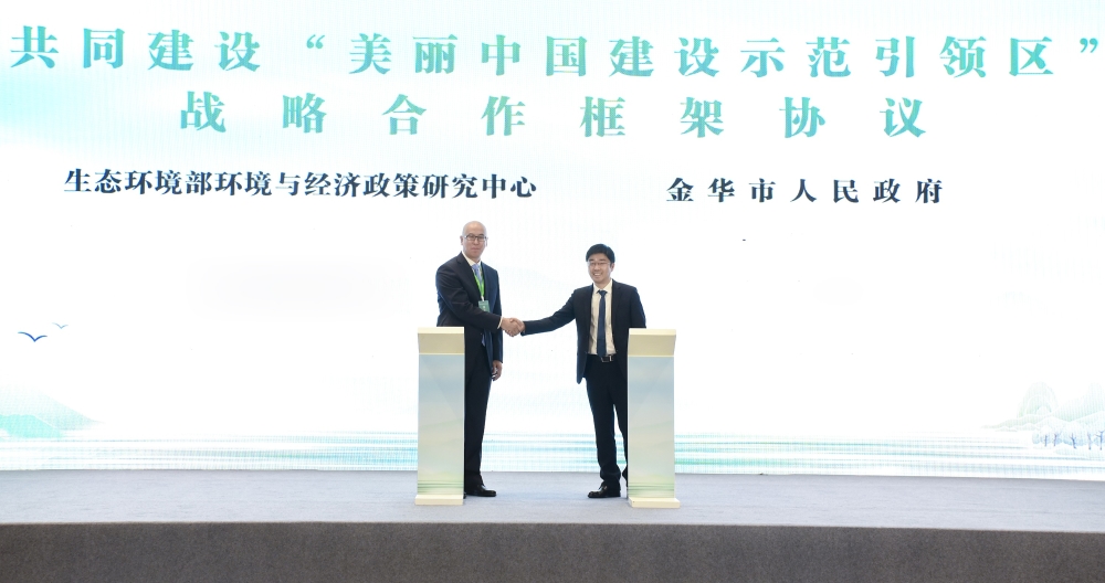 11月24日至25日,生态环境部与浙江省委、省政府在金华共同举办习近平生态文明思想浙江论坛。在24日下午举办的分论坛一 “习近平生态文明思想的创新与贡献” 上,生态环境部环境与经济政策研究中心与金华市人民政府签署战略合作框架协议。政研中心副主任俞海、金华市副市长阮刚辉代表双方签订协议。