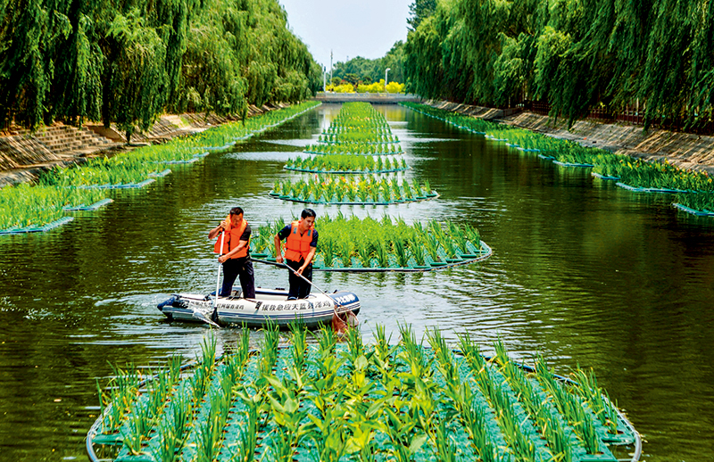 河北省邯郸市鸡泽县在河道治理中采用“生态浮岛”技术,种植挺水植物, 利用其根系的吸附和吸收作用改善水质,达到了生态治污的效果(6月20日摄) 王晓摄/本刊
